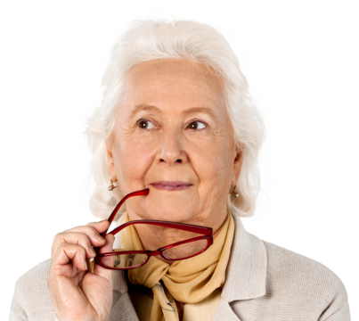 Face, thinking and finger of senior woman looking thoughtful and png isolated on a transparent background. Idea, wellness and mindset with a mature female contemplating a thought, choice or decision