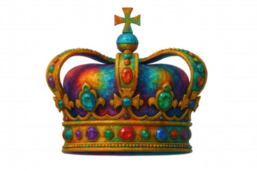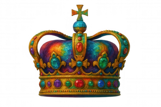 Majestic colorful crown adorned with vibrant jewels, isolated on transparent background, representing royalty, power, and authority