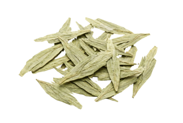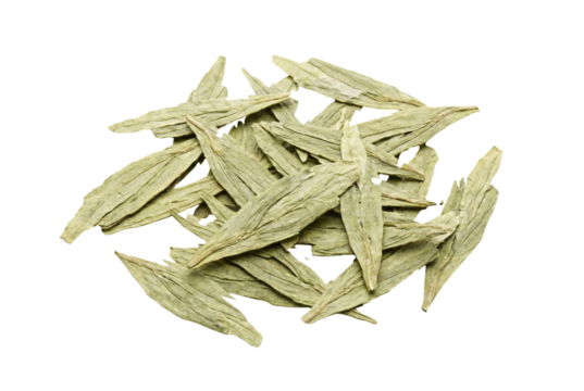Dried Longjing green tea leaves isolated. Traditional beverage ingredient.