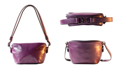 Front view and back view and side view of women's leather sling bag isolated on a white background.