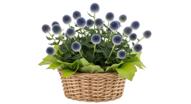 Isolated ornamental blue globe thistles in woven basket, decorative garden centerpiece