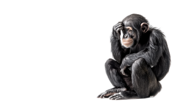 Thoughtful chimpanzee sitting casually with hand on its head, showcasing expressions of contemplation and curiosity against a clean background
