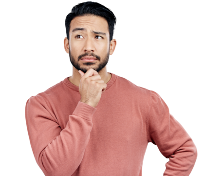 Confused, thinking and young man with ideas, decision and choice facial expression for question. Plan, brainstorming and Asian person with problem solving face isolated by transparent png background.