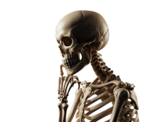 Human skeleton model in a thoughtful pose with its hand resting near its chin isolated on a transparent background for medical concepts.