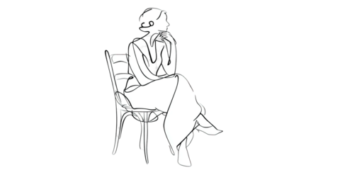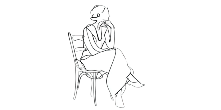 A black and white line drawing of a figure seated in a chair, thoughtfully posed