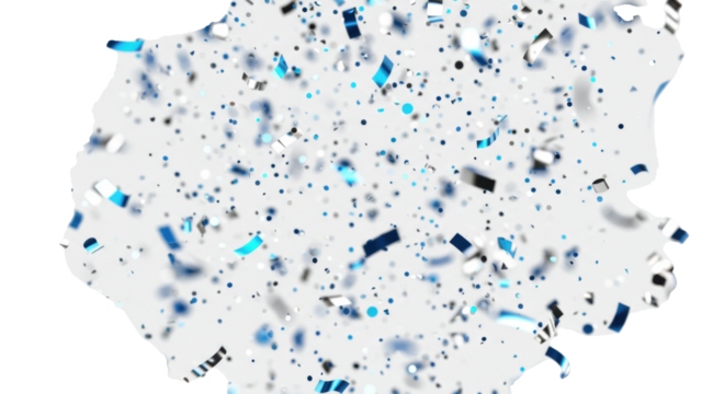 Thousands of sparkling silver and vibrant blue confetti and glitter pieces fall dynamically in an extreme close-up macro shot against a transparent background with festive bokeh, sharp focus,