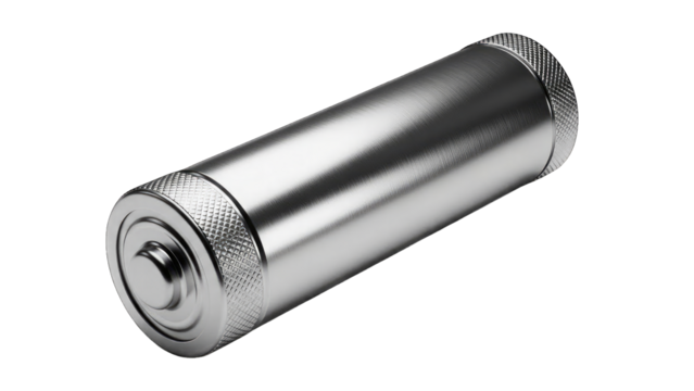 Closeup of a shiny metal cylinder with threaded ends isolated on transparent background