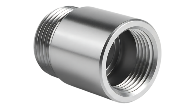 Polished metal pipe fitting connector with threaded ends for plumbing and industrial applications on transparent background