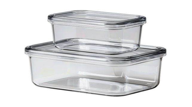 Food container set of three rectangular clear boxes stacked, plain lids without markings, balanced alignment, isolated on transparent background.