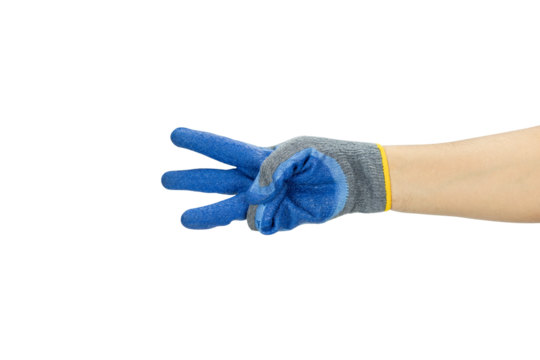 Worker's hand in a blue safety glove showing three fingers. A concept for counting or signals in construction, isolated on white background with clipping path.