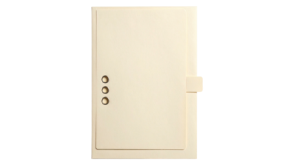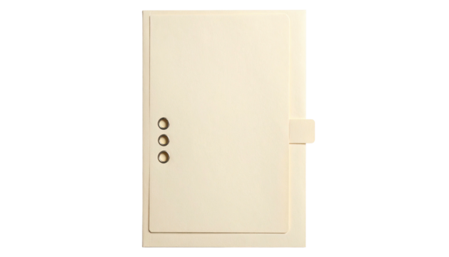 Beige rectangular binder, three holes, tab closure, blank pages in a black background
