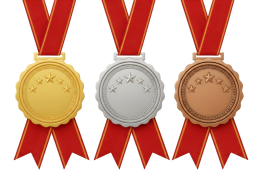 Image of super premium transparent photo of three olympic medals, gold, silver, and bronze, with red ribbons isolated on transparent background