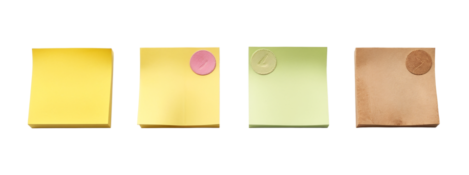 Three colorful square sticky notes with black binder clips attached at top edges, isolated on a transparent background