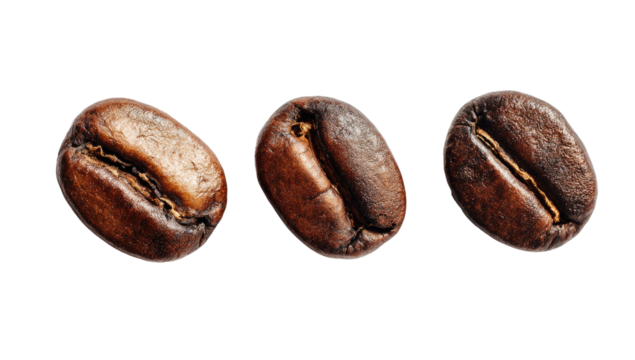 Three decorated christmas trees with red and gold ornaments and stars on top, isolated on transparent background