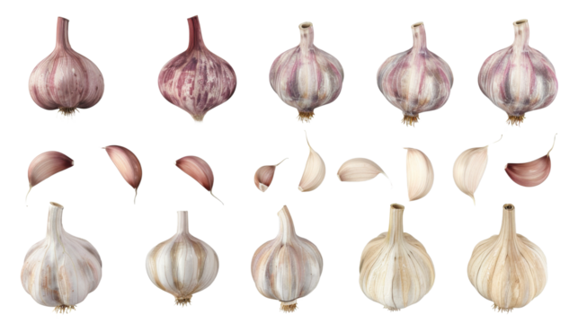 A group of mangosteens, some whole and one cut in half, on a surface transparent background