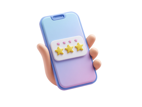 A hand holds a smartphone displaying a positive customer review,  with three gold stars on a pastel-colored background