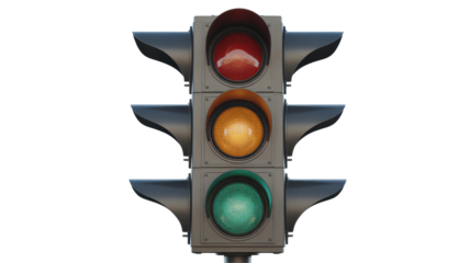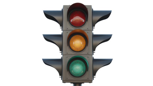 Close up view of a three way traffic light with all three signals red yellow and green illuminated brightly against a stark black background