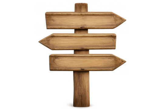 Isolated wooden signpost with directional arrows, conveying concepts of choice, navigation, guidance, and decision making in a simple and clear manner against a clean backdrop
