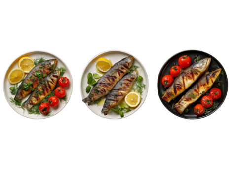 Variety of salmon sushi on round plate with bamboo mat transparent background