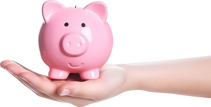 Hand holding a thrifty pink pig isolated on transparent background