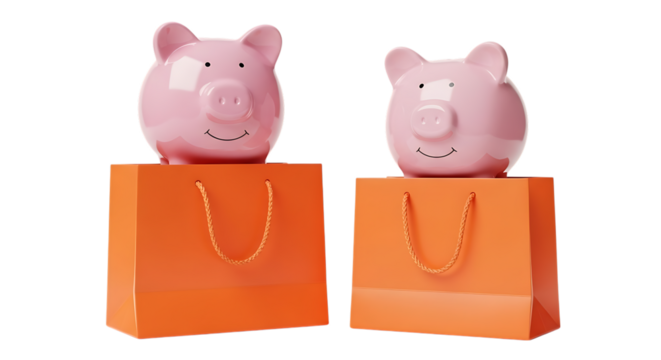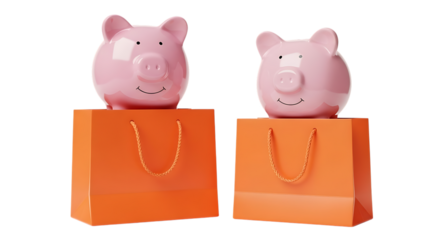 Two pink piggy banks on orange shopping bags