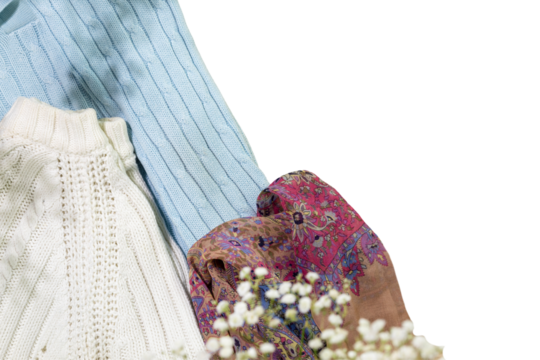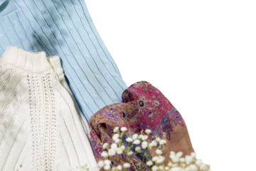 Second hand concept. Isolated different used clothes for sale on transparent background. Circular fashion, eco friendly sustainable shopping, thrifty shop concept