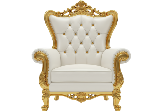 Ornate gold-framed throne chair with white leather and red velvet, fur trim