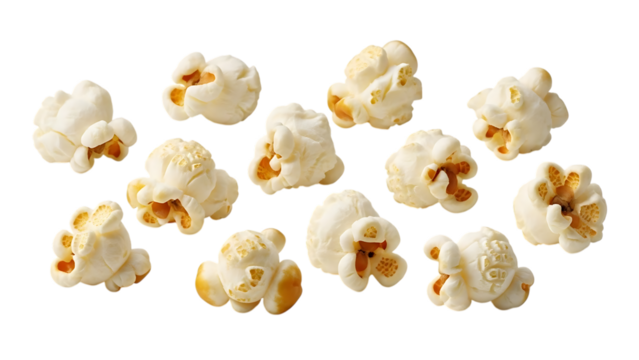 Freshly popped popcorn kernels flying through air isolated on transparent background