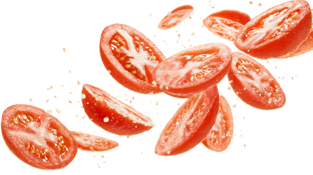Sliced tomatoes falling through the air isolated on transparent background