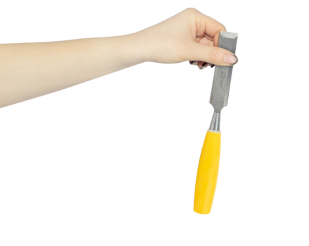chisel in outstretched hand, pass chisel to carpenter, isolated from background
