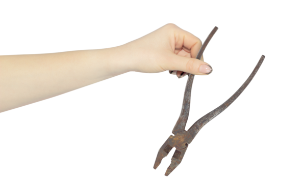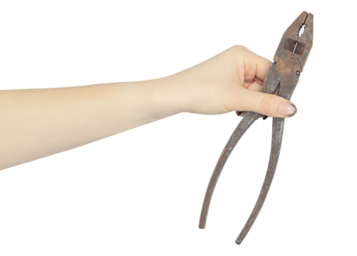 pliers in the hand, the hand holds out the pliers for working with electricity, isolated from the background