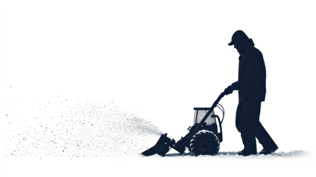A lone man operating a snow thrower on a snowy landscape. Winter activity and snow removal