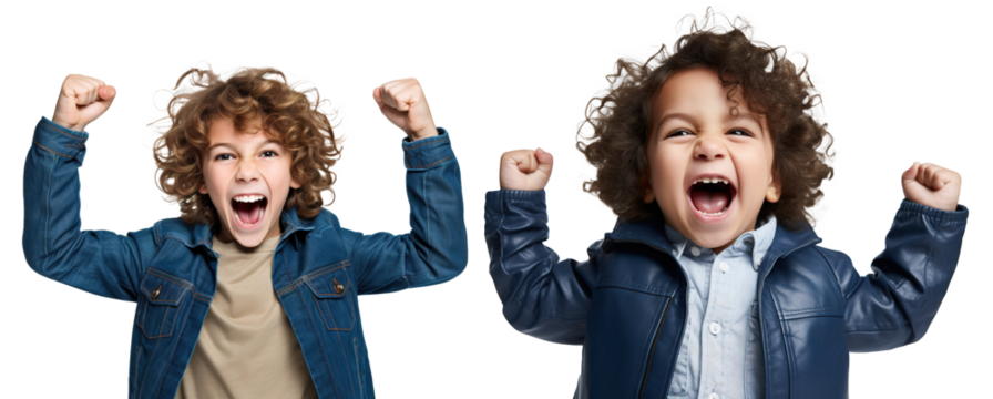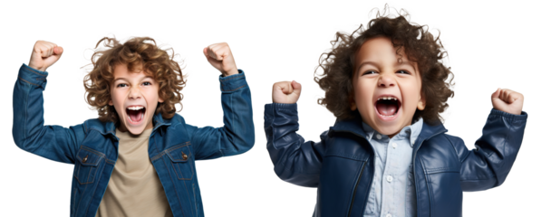 set of emotional, happy, excited, cheering teenager boy kid - celebrating, throwing arms up. on transparent background