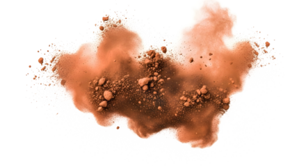 Explosion of rich brown orange clay powder isolated on a white background. Abstract cloud of fine dust particles suspended mid-air