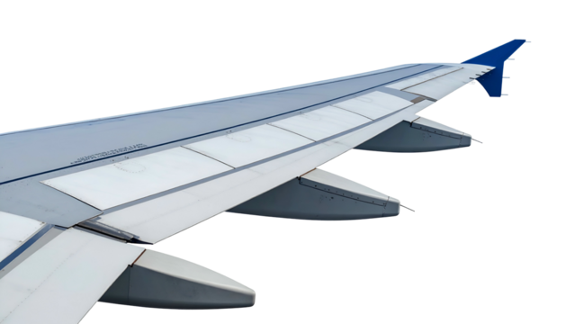 Close-up of an airplane wing with a red and white tip against a black background