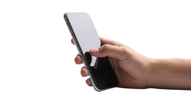 A person's hand holding a modern black smartphone, with their thumb touching the blank screen on a white background.