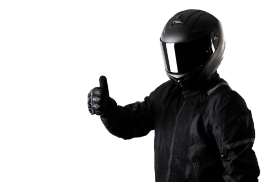 Portrait of a motorcycle rider on a transparent background with thumbs up expression