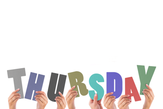 Golden foil balloons spelling out the word THURSDAY on a black background thursday day of the week isolated on a transparent background
