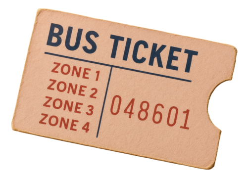 Vintage-style bus ticket displaying zones and a serial number on transparent background.