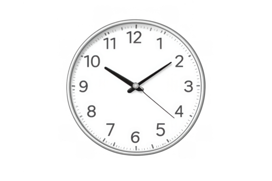 Analog wall clock showing time, white face with black numbers, silver frame, minute and hour hands, transparent background