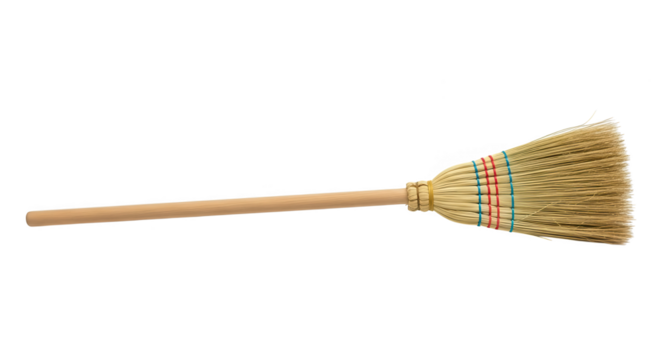 Golden straw broom with wooden handle isolated on transparent background, a domestic tool for cleaning and housekeeping, used for sweeping the floor and maintaining tidiness in the home