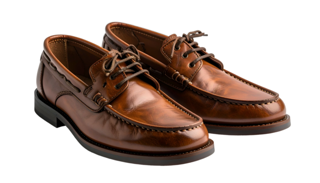 Classic brown leather hiking boots with tied laces, isolated on a transparent background, ready for outdoor adventures
