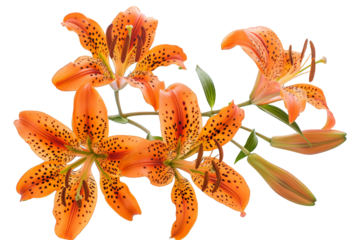 Isolated tiger lily bouquet of orange flowers with green stem and leaves plant decoration