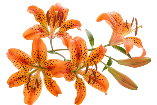 Closeup of a vibrant orange tiger lily isolated on transparent background, showcasing its intricate details and delicate petals in a captivating floral display