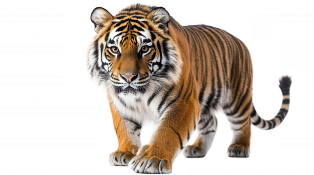 Majestic adult tiger walking with strength and grace isolated on bright white background for visual impact