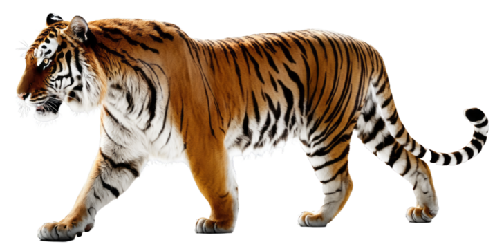 Side profile of a powerful tiger mid-step, focused eyes and vibrant stripes, realistic fur texture, real look, full view, on white background, 4k, unique, no blur, clear view