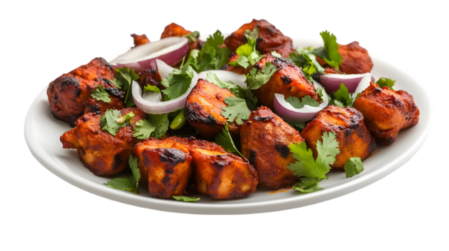 White plate of chicken tikka on a transparent background. isolated background.