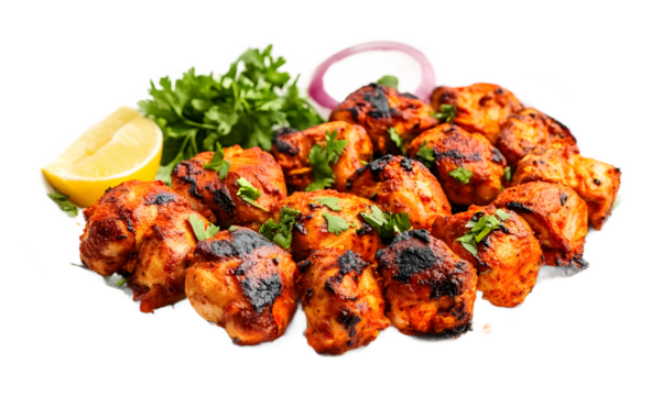 Spicy Chicken Tikka on White Background – Food Isolated. spicy chicken tikka, chicken tikka isolated on white, grilled chicken tikka pieces, chicken tikka Indian food, chicken tikka Pakistani cuisine,