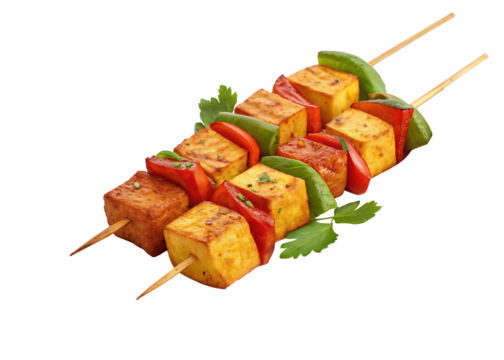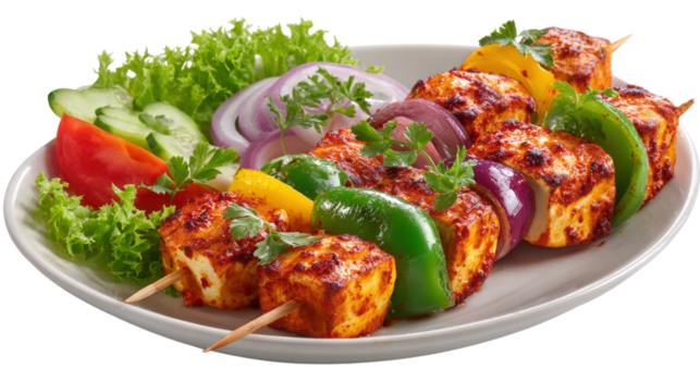 A serving of paneer tikka skewers, isolated on transparent background, vibrant colors.