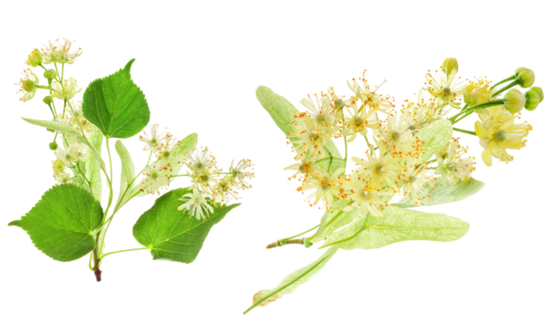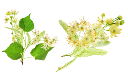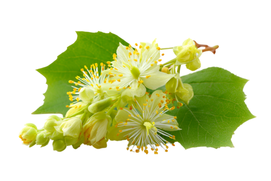 linden flowers with green leaves isolated on transparent background.